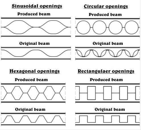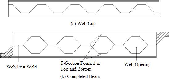 increasing depth ultimately improving moment of inertia. There byincreaseinmomentof resistanceandcontrolled ondeflection.Thisprocessincreasesthedepthofthebeam by approximately 50%, therefore increasing the strength and stiffness by about 20 to 30% without increasing the weight of the beam. Also the holes in the web allow ductwork to run through beams instead of 2 underneath ultimately reducing the depth of the floor system