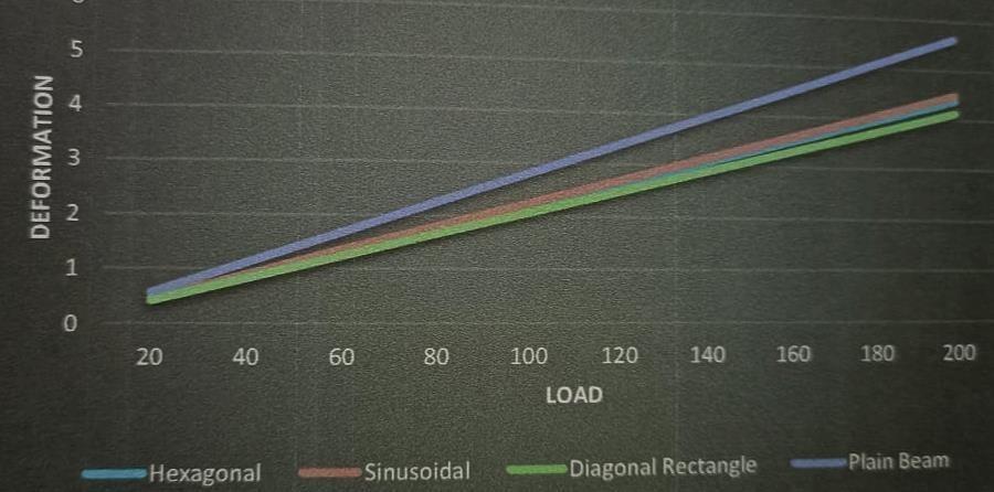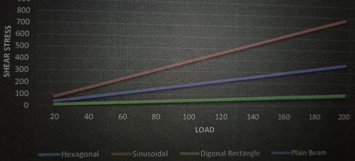 From this graph between load and shear stress for the load of 200KN the beam with hexagonal web opening gives minimum shear stress i.e. 90.123 N/mm as comparedtootherbeams.