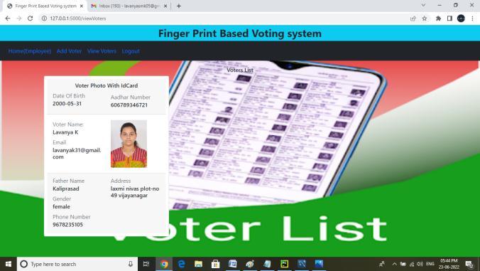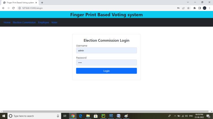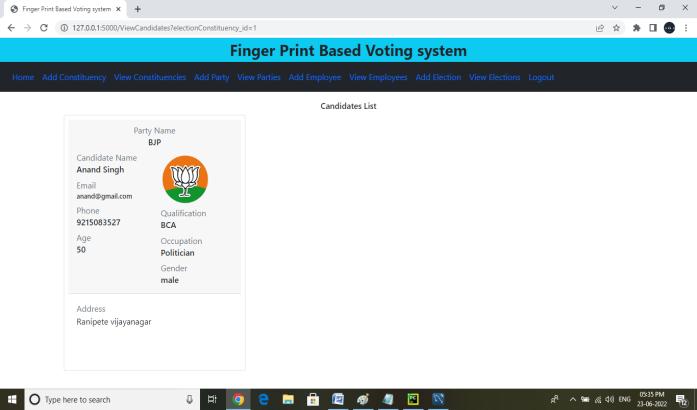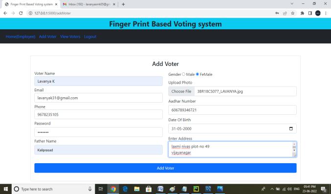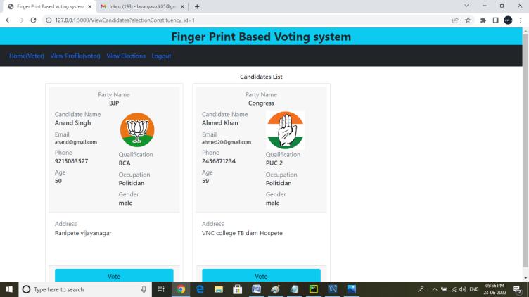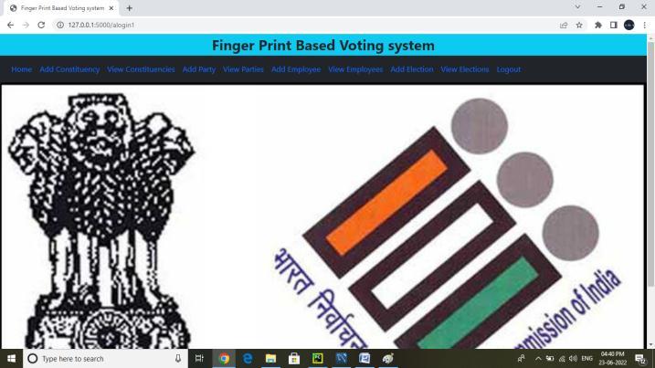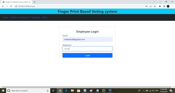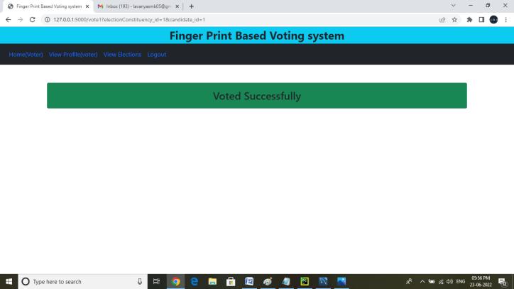 Voter: Voter’s can login into their accounts with email and OTP. When a voter enters an email the auto generated OTPwill reach the voter's email. The Voter’s can login with the OTP. voters can view elections that theyareeligibleto votefor, voters canvoteforelection with fingerprint sensor. Voters can view their votes.