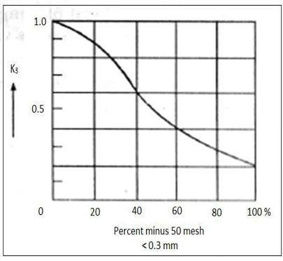 Figure4showsgraphofK3againstpercentminus50mesh. K3 is the factor to take into account the amount of fines particlesinthebulk material.Ifthebulk material contains 20%offineparticleslessthan0.3mm(50mesh),thefactoris 0.85.Ifthebulkcontains60%fineparticleslessthan0.3mm, thefactoris0.4.
