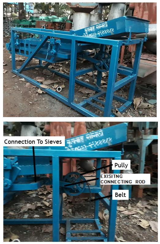 Combination of feeding and sorting of raisins machine consists of three motors, feeder, three sieves, blower, and beltandpulleymechanism.Figure 1showsthetypicallayout orconstructionofsortingplatformofexistingusedmachine. A2HPmotordrivesthevibratingsieve.Motiontovibratory sieve is given by connecting rod which is eccentrically connected to the motor shaft. Vibrating motion of sieve is guided by the connecting rod which is hinged to the foundation