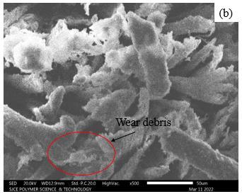 Furthermore, abrasion and cracks are detected on the samplesurfacethatwasdrivenbyagreaterslidingdistance, aswellasincreaseddebrisaccumulation.