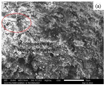 Figure 4 (c) depicts the micrograph of Ra10G30 sample. From the micrograph it is found that lowest wear rate obtainedinRa10G30compositewiththemaximumsliding distanceless weardebriscanbeseen[14].Alsothere is a goodregistrybetweenfibresurfaceswiththematrix,which