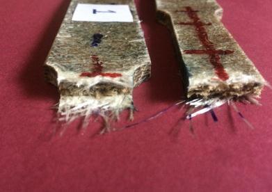 Delaminationisconstrainedbythrough thicknesscompressionstress.Commonthingobservedisglassfiberfractureandpull out,considerabledamagetojutefibersduetosplittingfromthestrands.Transversecrackscanbeseenattheimpactpointin bothcases,withthesample1impactedspecimenhavingalongercrack.