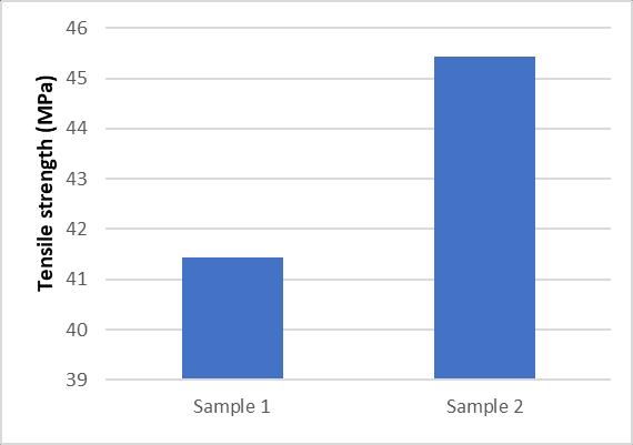 Thecompositesspecimens’sample1andsample2aretestedfortensilepropertiesinUTMandobtainedtensilepropertiesare shown in Table.2. The load vs displacement curves are shown in Figure 10 and 11. The Sample 1 which is oriented at 30° showsahightensilestrengthof45.436N/mm2andSample2whichisorientedat0°showsalowertensilestrengthof41.447 N/mm2,socomparativelySample2showsbetterresultsthantheSample1.