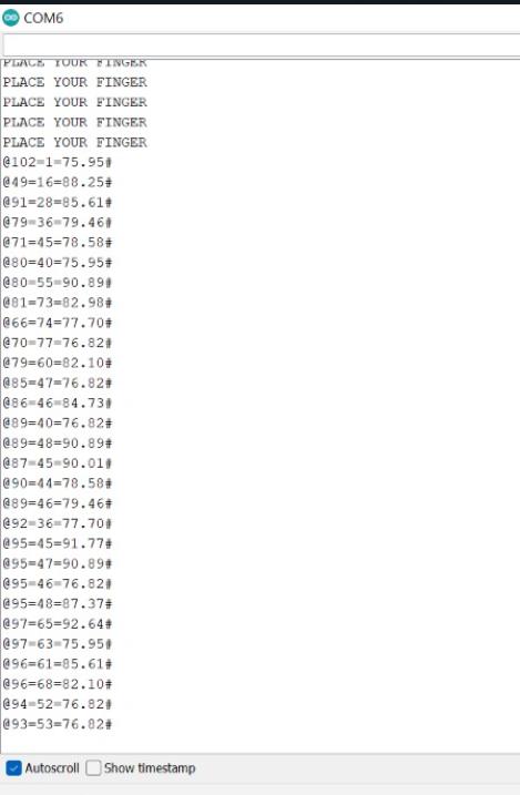 Fig -6:SerialMonitorOutput(Heart rate,OxygenLevel andTemperaturereadings)