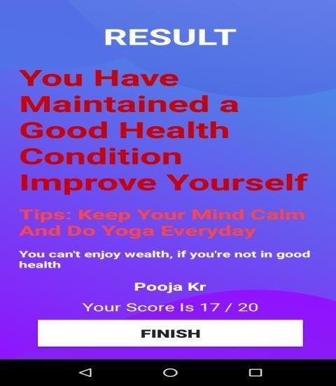 3.3 By machine Learning Algorithms, the App was predicting the future results: Out of Logistic Regression, Naive Bayes, SVM (Support Vector Machine), and k Means have the highest accuracy in our case. It includesasequenceofinquiriescommonlyusedtopredict a person's mental health. A user friendly interface is created where the user can answer a series of questions. Each correct answer is worth some points. After the user enters answers to all questions, the average points are calculated,andhismentalhealthispredicted.Asuggestion willbemadetotheuserbasedontheirresponses.
