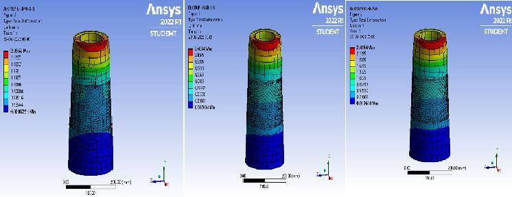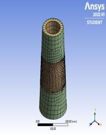 TaperedCFDSTcolumnsaremodelledinANSYSsoftware. Thelocalgroovecorrosionisprovidedinvertical,horizontal and inclined direction at different depths of the tapered CFDST columns. Length of column is taken as 420mm, thickness of the steel inner and outer is 3mm and 5mm respectively.Thesurfacecorrosionisprovidedintheformof reducingthethicknessofthesteeltubeModellingofconcrete andsteel is donebyusing element types of SOLID186and hexahedronmeshingisprovided.Programcontrolledcoarse meshisadoptedformeshingthecolumns.Loadisappliedas displacement of 10mm according to displacement convergencemethod.