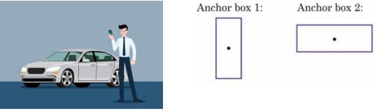 Eachanchorboxofeachgridcellcanpredictoneobjecti.e., foramodelwhichtakesSxSgridcellsandnanchorboxes.It can predict S*S*n objects in an image. The anchor boxes predicttheobjectsintheimagewhichhavesimilarratiosas them.Forexample,wehave2objectsinanimage(fig2)a person and a car. Here the anchor box 1 will predict the person as it is in similar ratio and the anchor box 2 will predictthecarintheimage