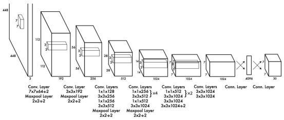 YOLOusesmultipleConvolutionallayersfollowedbyfully connected layers. The output of the last layer has (S, S, B*(5+C)) dimensions. The architecture in the above Fig. 3 uses 7 x 7 grid cells and 2 anchor boxes per cell with 10 classes