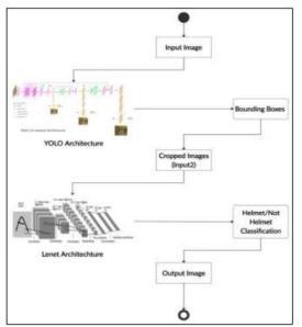 TheworkhasbeendevelopedusingYOLOv3andclassified basedonLeNetarchitecture.Fig.5.1showstheblockdiagram fortheproposedsystem.First,weapplytheobjectdetection algorithm YOLOv3 to obtain the two wheeler riders. The boundingboxesobtainedcontainalltheobjectsdetectedin theimagebelongingtothe80classesoftheMSCOCOdataset anditfiltersonlytheclassesofpersonsandlargevehicles. Theseboundingboxesarethencroppedfromtheimageand forwardedtotheimageclassificationalgorithm.Theimage classifier uses the LeNet architecture and is trained to recognizethehelmetsfromnon helmets.