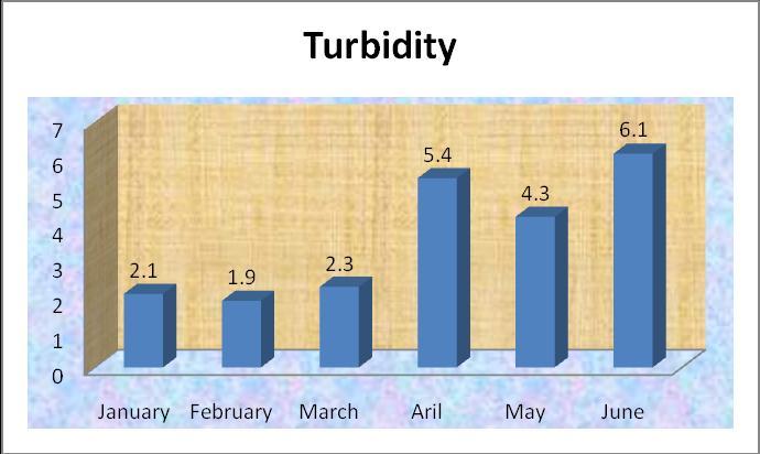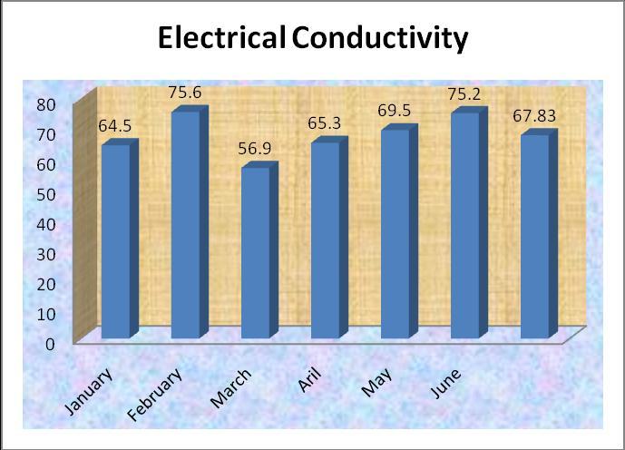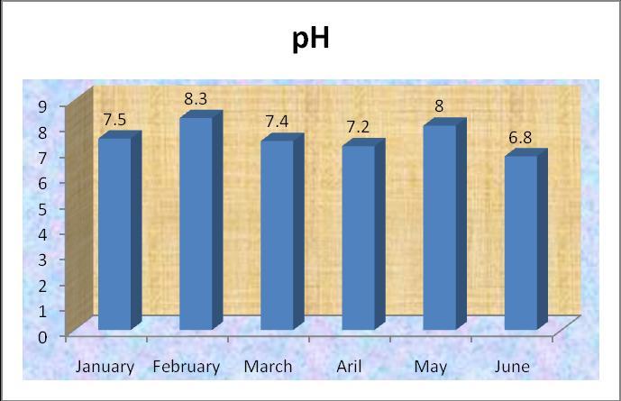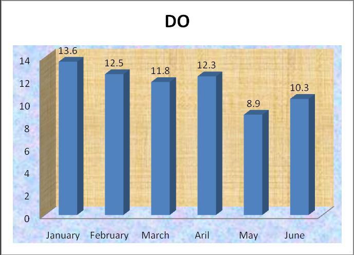 indices for rating the quality of water of study area.pH of groundwater value was found highest in the month of February i.e. 8.3 and lowest in the month of June i.e.6.8 respectively.TheaveragepHvaluewas7.5.Theaquiferin the study area is mostly vesicular basalt which imparts alkalinenatureofwater.ThesafelimitofpHliesbetween6.5 and8.5.Theslightacidicnatureofafewsamplesindicates impactofindustrialinfluenceonthequalityofgroundwater. TheTemperatureofgroundwatervaluewashighestinthe monthofMayi.e.28.3 oCandlowestinthemonthofMarch i.e.25.3oCrespectively.TheaverageTemperaturevaluewas foundi.e.26.9oC.TheElectricalconductivityofgroundwater valuewashighestinthemonthofFebruaryi.e.75.6µS/cm and lowest in the month of March i.e. 25.3 µS/cm respectively.TheaverageECvaluewasfoundi.e.67.8µS/cm (Davis and Wiest; 1996).Dissolved Oxygen (DO) of groundwater value was found highest in the month of Januaryi.e.13.6mg/landlowestinthemonthofMayi.e.8.9 mg/l respectively. The average DO value was 11.5.BOD of groundwater value was found highest in the month of January i.e. 27.9 mg/l and lowest in the month of April i.e.16.3mg/lrespectively.TheaverageBODvaluewas22.5 mg/l.COD of groundwater value was found highest in the month of April i.e. 13.2 mg/l and lowest in the month of Januaryi.e.9.2mg/lrespectively.TheaverageCODvaluewas 11.2mg/l.TDSofgroundwatervaluewasfoundhighest in themonthofJanuaryi.e.358mg/l andlowestinthemonth ofMayi.e.289mg/lrespectively.TheaverageTDSvaluewas 327mg/l.Turbidityofgroundwatervaluewasfoundhighest inthemonthofJunei.e.6.1NTU andlowestinthemonthof February i.e.1.9 NTU respectively. The average Turbidity valuewas3.6NTU.