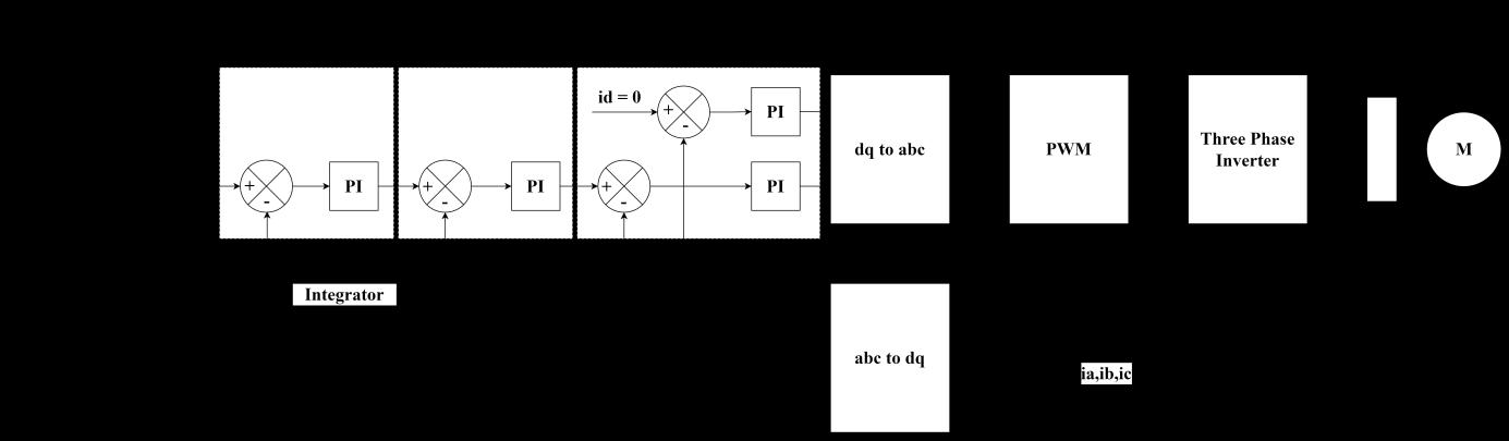 In order to maximize torque and overall efficiency, the direct component must be ideally maintained at zero and quadrature component is generated based on torque and speed requirements. The reference values are compared withactualvaluesandviaaPIcontroller,thecorresponding voltage is calculated. The voltage in dq reference frame is converted back to alpha beta coordinate system using Inverse Park’s transformation as shown (15 16). This is typicallyusedtogeneratethegatepulsesusingSVPWM. (15) (16)