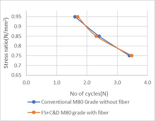 6) In fatigue test, the maximum replacement of foundry sandis15%,byprovidingpoly propylenefibreof0.3% dosagebyvolumeofcemetitiousmaterialstoHPC.For stress ratio 0.95, FS+C&D M80 with fibre can sustain 19.8% more repetitions than Conventional M80 grade concretewithoutfibre.