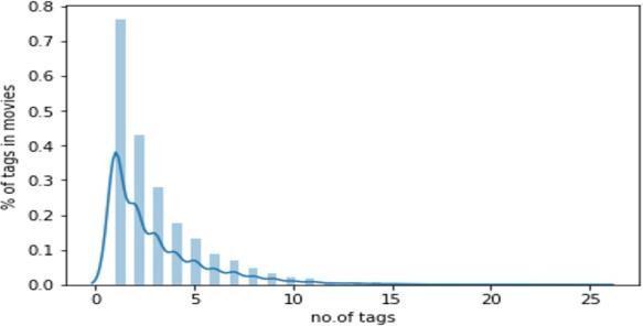 wecreatedaSQLdatabase file of the given source CSVfileanddeletetheduplicateentriesandmodifythesame by adding a new custom attribute (6+1) tag count which indicatesthenumberoftagsassociatedpermovieso,wecan findtheexactcount,howmanymoviesareassociatedwith how many tags. we also checked the number of unique tags present inthe dataset using the BOW (bag of words) technique whichisimplementedusingthecountvectorizer method.Wemusttransformitintovectorsofnumberssince machinelearning algorithmsdonotaccepttherawtextas inputdata.BagofwordsistheeasiestwaytorepresentText Documents. In other words, it will determine how many times a specific wordappears in a given document. This method yielded a tag cloud such as flashback, violence, murder, romantic and cult. This way we produced a more genericversionofthecommontagsrelevanttotheplotofthe movie. On the other hand, tags such as entertaining, and suspensefulareslightlylesscommongotfiltered out.