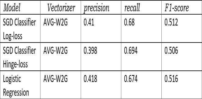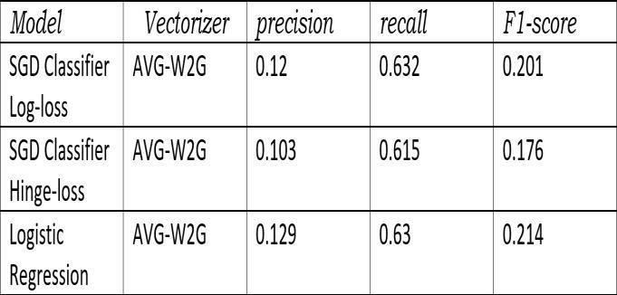 MultinomialNBstaysthesamein all variants. The f1of SGD Classifier log loss increases from 1 to 2 grams and decreases from 3 to 4 grams (but still ¿ 1gram). SGD Classifier hingelossdoesn’tshowmuchvariationandlogistic regressionalsostaysthesameinallcases.ButthistimeSGD Classifier loglossshowshighestscore(ofallvariants)incase of2grams,thatis0.568.Here2gramsperformanceisbetter compared to the rest.”fig 10”