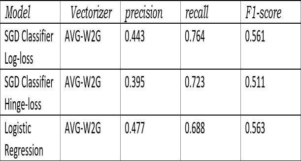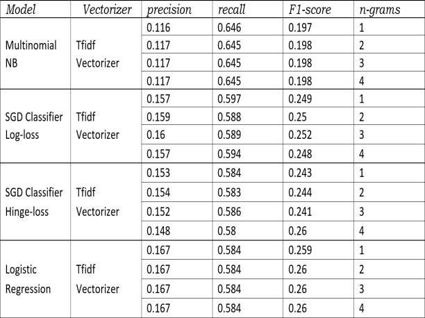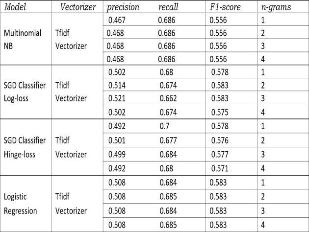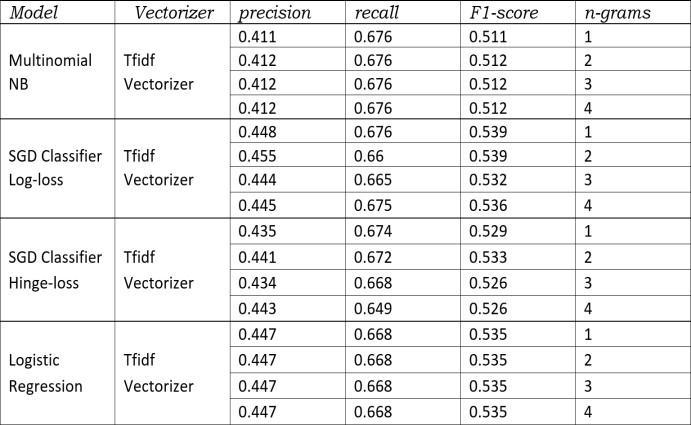 IncaseofMultinomialNBthescoredecreasedfrom1to 2gramsandstayedsamethrough2,3,4grams.Andwhenit comestoSGD Classifier log loss itdecreased from 1 to 2 to3andincreasedin4grams(andthisisthemax).SGD Classifier hingelossincreasedgraduallyandhighestisat4 grams. And now comes the logistic regression it’s score increased from 1 to 2 grams and remained unchanged later and logistic regression showed highest scores in individual models of 1, 2, 3, 4 grams and also in the overall case (andit is 0.26). And on a overview 4 grams model gave the better results when compared with the rest.Figure ”fig 9”.