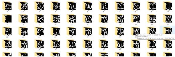 then the remaining next processes are easily carried out. Afterdatacollectionthecharactersneedtobesegmented. The data collection contains 25 characters in each folder. Therewillbe15,675charactersneedtobesegmentedand savedintherespectivefolders.Thedatasetincludesthese characterswhichareshownbelow.