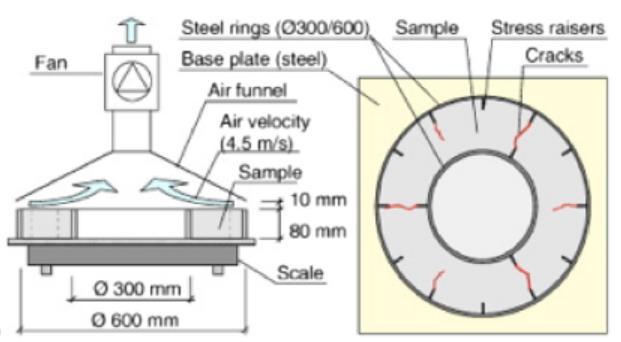 i.ASTM C1579 13 method in which the specimen is preparedinamouldwithinternalrestraints.Theconcrete specimen is placed in drying settings which prompt plasticshrinkagecrackingintheconcretespecimen. ThemouldusedisshowninFig 3and4