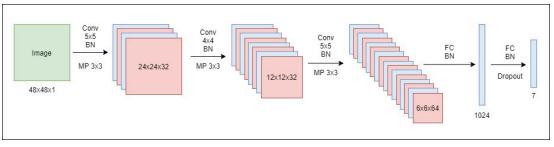 Five LayerModel:Thismodel,asthenamesuggests,consists offivelayers.Thefirstthreestagesconsistofconvolutional andmax poolinglayerseach,followedbyafullyconnected layerof1024neuronsandanoutputlayerof7neuronswith asoft maxactivationfunction.Thefirstconvolutionallayers utilized32,32,and64kernelsof5*5, 4*4,and5*5.These convolutionallayersarefollowedbymax poolinglayersthat usekernelsofdimension3*3andstride2,andeachofthese used ReLu for the activation function. The visual representationofthemodelarchitectureisshowninbelow figure.