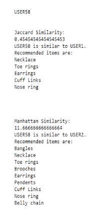 In the collaborative system using similarity metrics, we considered our dataset consisting of 100 users and rated 15 jewellery items. The rating range is from 0 to 5. Our code has been implemented using python. There were a few blank spaces in our dataset which denote that the particularuserdidn’tratetheitem.