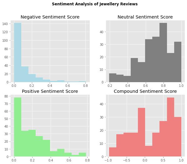 6.3. Forvisualisation,print4histograms,each consisting of one of each VADER Sentiment measurement (polarity classifier) and a bar plot Avg. Sentiment Score(Compound)perRating.