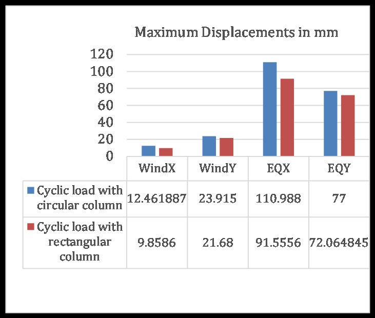 a. Displacement : Lateral displacement or sway is usually found when lateral load is applied to a structure. The lateral load may be seismic or wind load. In case of wind forces, circular column building shows maximum displacementwhichisaround25%morethanthebuilding with rectangular column. Result shows that the behavior of becomes more flexible when circular columns used in building.Thisabsorbsmoreamountofenergyascompare torectangularcolumn.