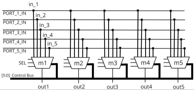 3. Thecrossbarmodulehasseveninputportsandfive output ports and five wires for intermediate connections.