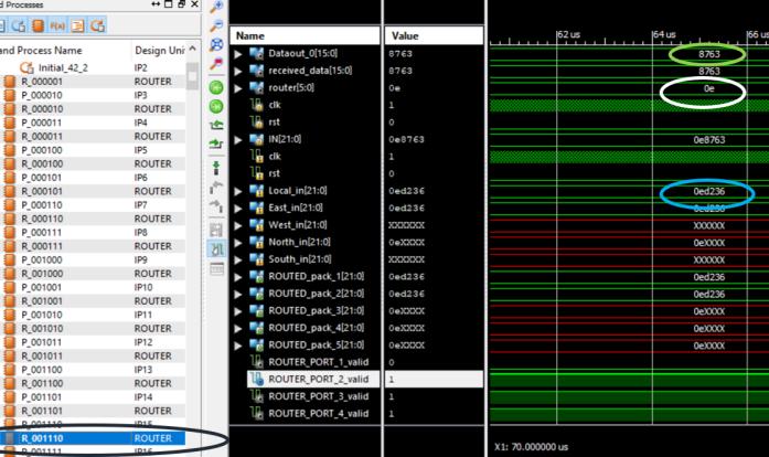 Once all the sub blocks are designed and verified, we instantiateallthemodulesinthetopmoduletoformasingle router.Apacketformatof22bitsisconsideredofwhich6 bitsdenotethesourceanddestinationaddress,remaining16 bitsdenotesthemessage.Thenthesinglerouterismultiplied 9 times to form a 3x3 router, and 64 times to form a 8x8 router.Toverifythefunctionalityof 8x8router,initiallya testbenchiswrittenandsimulated.Thesimulationresultsof the8x8routerareshowninFig 9.