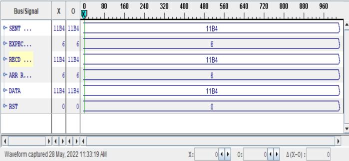 ChipScope Tool is used to implement the project and additionalfilesrequiredtoimplementarewrittenandadded asasourcetothetopmodule.Dataportwidthistakenas57 and classified 16 ports for sending data, 16 ports for receivingdata,16bitsforthedata,4bitsforexpectedand arrivedportand1portforreset.Thentriggersetupisdone andwaveformisaddedtothewindow.Theimplementation anditsresultsareshowninFig 1.