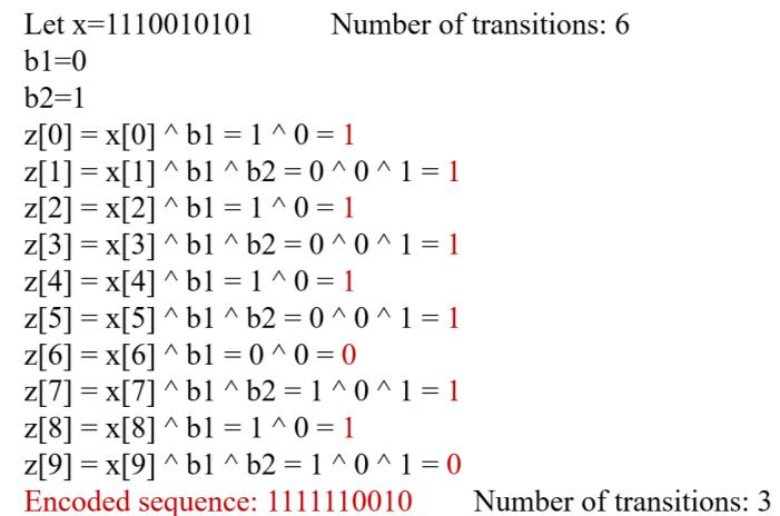 Before implementing it on the FPGA, we have written an algorithmtooptimizethepower.Thealgorithmisaimedto reduce the transitions in the message bits. For this we adopted the encoding and decoding techniques. Before transmittingthemessageisencodedusingthebitsb1and b2.Anycombinationofb1andb2canbetaken, butinthis project,wehavetakenb1as0andb2as1.Alltheevenbits areXORwithb1andoddbitsareXORwithb1andb2.The samedecodingtechniqueisusedatthereceivertoretrieve theoriginalmessage.AnexampleisshowninFig 10.From the figure we can see that the number of transitions is reducedfrom6to3,whichreducesthepowerconsumption duringtheprocessoftransmitting