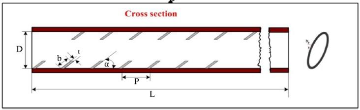 Weemployserpentineheatexchangerwithcurvedinternal flapsoftubeoflengthofL=2000mm,with50.8mminner diameter (D), 53 mm outer diameter (Do), and 1.5 mm thickness (t). The dimension of curved vortex flap is defined by its length = b and its angle α we design heat exchanger with α = 30°, b/D ratio of 0.1 and 0.2 and pitch (P/D)of0.5,1and1.5.