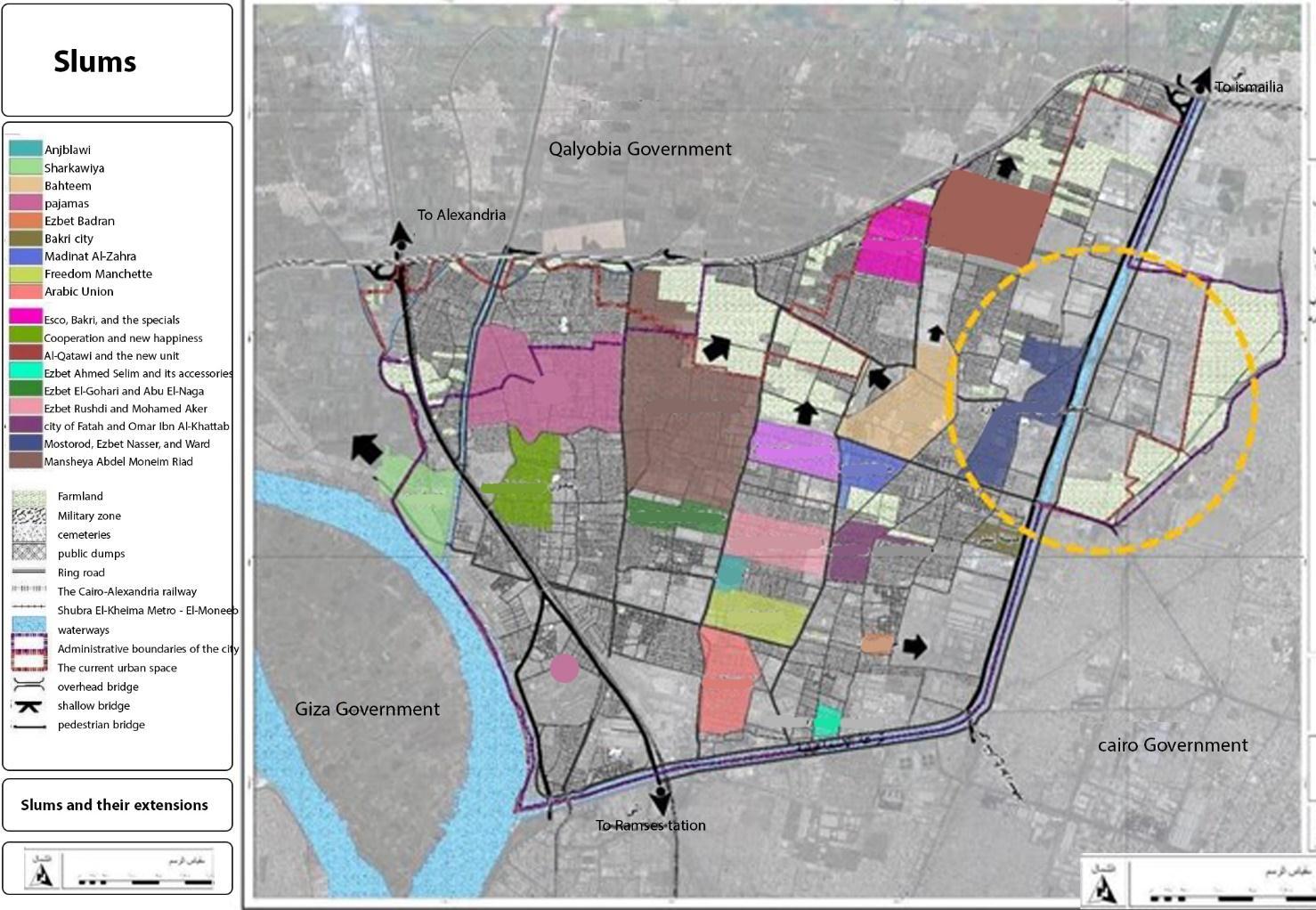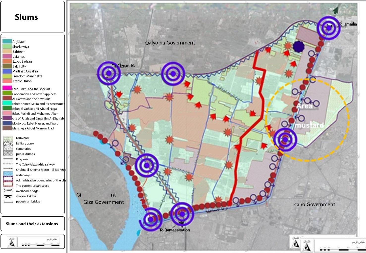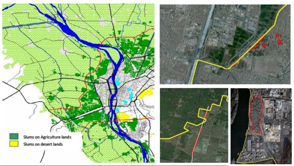InthisstagethepaperwillexplaintheissueswhicheffectonsustainabilityinthisareaDetermininganddefiningtheslums inthe industrial zonesand defining thesocial,environmental,urbanandeconomic aspectsandproblemsintheslums in ordertoputinplaceadaptationandmitigationmechanismsinordertoimprovetheenvironmentintheareasadjacentto the industrial zones. Data from the Ministry of Housing in Egypt indicate that the number of "informal settlements" is about 15 million citizens, distributed over 497 residential areas throughout the republic, but a large percentage of them arescatteredaround"GreaterCairo",whichincludesthegovernoratesin.(seham,mohammed,&nada,2022)Thesummit oftheNileRiverDeltaTriangle.TheseareCairo,GizaandQalyoub(Actionarea Shubra),ofwhichabout20%areinCairo governorate, 13% in Giza governorate, and 8% in Qalyoub (Action area Shubra ) governorate. Slum areas and random markets,AccordingtotheCentralAgencyforMobilizationandStatistics,12millionEgyptiansliveingraves,nests,garages, mosques, and under the stairs, according to a recent report. In Cairo's Al Basateen, Al Tunisi, Imam Al Shafi'i, Bab Al Wazir,Al Ghafir,Al Mujawireen,ImamAl Laithi,andAinShamscemeteries,1.5millionEgyptiansarelived. Asshownin the following maps figure2) ( The researcher based on the data of the GOPP) .(2020 International Journal of EnvironmentalHealthEngineering(