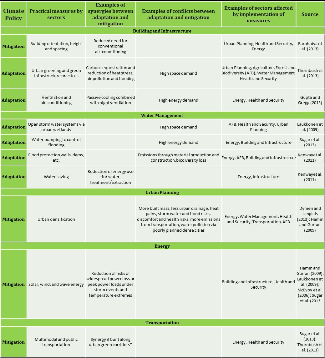 Inurbanareas,adaptationmeasuresareimplementedthroughurbanplanningandmanagementsectorsthatfocusmainly on zoning, building codes, water quality, flood protection, and surface runoff management Adaptation also includes measuresthatincreasetheindoorclimatecomfortofbuildings suchasheating,ventilation,andairconditioning (HVAC) and cool roofs (white and green) that address the UHI (McEvoy et al., 2006) as well as green (vegetation, permeable surfaces) and blue (bodies of water) measures to increase climatic comfort, control flooding, and enhance urban biodiversity.(David,2008)