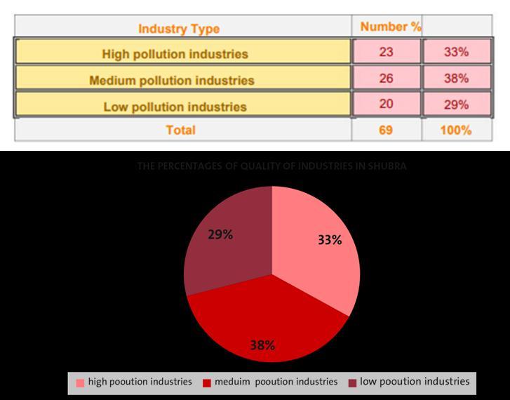 Shubra El Kheima is one of the important industrial cities that is famous for its petroleum products industries, an industrial area in Shubra, spinning and weaving, and Eid among other industries. The area of industrial uses in the city reached1092.95acres,Shubra,spinningandweaving,andEidamongotherindustries.Theareaofindustrialusesinthe cityreached1092.95acres,glassindustriesarespreadintherestofthecity.(Guttikunda,Nishadh,&Jawahar,2019)The mappresentsthefollowingtable:classificationandanalysisofindustriesinglassindustriesarespreadintherestofthe city. The map presents the following table: classification and analysis of industries in the city and their environmental impactsusingGIS(seham,mohammed,&nada,2022).