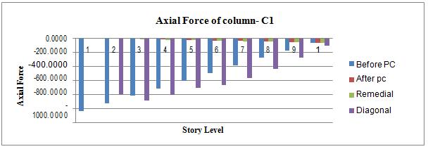 increasesconsiderablyaftercolumnstrengthlosssuddenlyitdoesnotleadtofailureofthemember,becausesectionsused havesufficientcapacitytoresistshearforceincreased.Ithasbeenobservedthatthereisno effectonshearforceofbeams forcolumnstrengthlossatdifferentlevel.Alsoweconcludedintheabovegraph4.1(d,e&f)thereIschangeinaxialforce and bending moment as inaxial force when weremoved the critical column there is drastic decrease in axial force at the criticalcolumnwhereasinothercolumnthereisincreaseinaxialforce.Whereasinbendingmomentcasethereisincrease inmomentinclockwisedirectionforalladjoinbeamsnearthecriticalcolumnlinearstaticanalysis.