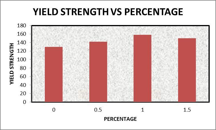 Theyieldstrengthofahybrid compositedepends onthe amount of reinforcement. This is shown in Chart 3 The yieldstrengthvaluesforSamplesA,B,andCshowninTable 6.1indicateasignificantincreaseintheyieldstrengthfor SamplesBandCcomparedtothebasematerial.Theyield strengths of Samples A, B, and C are increased by 9.2%, 21.5%, and 15.38%, respectively, compared to the base metal.