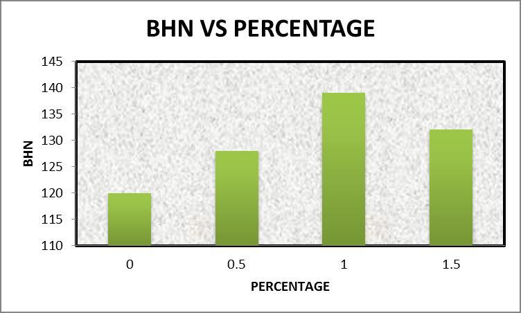 ThehardnessofSamplesAandCincreasedby6.6%and10%, respectively,comparedtothenon reinforcedmetalmatrix (base material). However, for Sample B, the hardness was dramatically improved by 15.8% compared to the unreinforcedmetalmatrix.Chart 2showsthattheBHNvalue ofhybridcompositesishigherwith1%reinforcement.Italso showsthatincreasingtheamountofreinforcementreduces theBHNvalue.