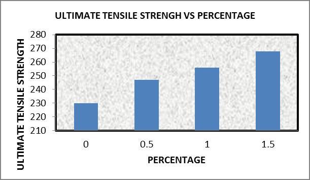 TheultimatetensilestrengthofNanocompositesdepends ontheamountofreinforcement.ThisisshowninFigure4 andfigure5.TheextremetensilestrengthvaluesforSamples A, B, and C shown in Table 6.1 indicate that the ultimate tensile strengths for Samples B and C are significantly increasedcomparedtothebasemetal.Thetearstrengthsof Samples A, B and C are increased by 7.39%, 11.30% and 16.52%,respectively,comparedtothebasemetal.Theslight improvement in the strength of sample A may be due to inadequateadhesionbetweenthereinforcedparticlesand the matrix compared to the other two samples of the aluminumNanocomposite.Inthegraphvariationoftensile strengthindifferentpercentagesisshownin Chart 1.