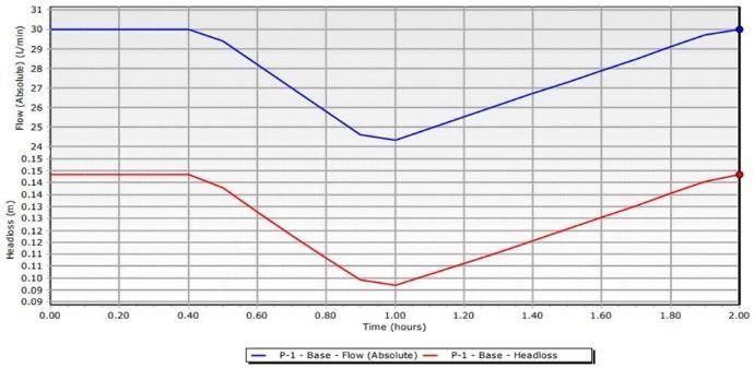 For each Junction the value of hydraulic Grade (Hydraulic Head) is calculated. Simulation Results are showninthetable5.3.Thedataisarrangedinascending of Hydraulic grade. Such as Junction 1 has the least hydraulic grade of4.77 m and Junction 4 has maximum grade of 6.14 m at30L/mindemand.