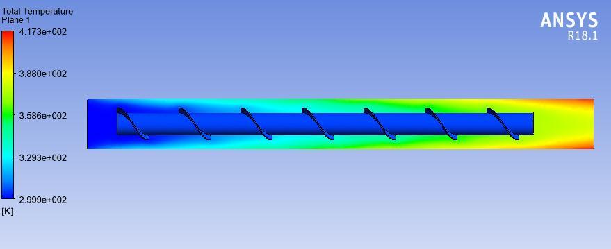 Al2O3/water (1 percent volume fraction) is used as the fluid, and the temperature map is obtained for the helical screwtapeinsertinthepipe.Thecontourplotshowshow the temperature rises as you move from the fluid inlet to thefluidoutletwall.Theheavybluetint,whichgetslighter as you get closer to the exit, indicates a temperature of 300K at the fluid input. The contour plot shows a temperaturedifferencefrom300Kto358Kinthemiddle, which is shown bythecolour green, to 417 K towardsthe exit,whichisshownbythecolourredontheedgeandthe colouryellowinthemiddle.