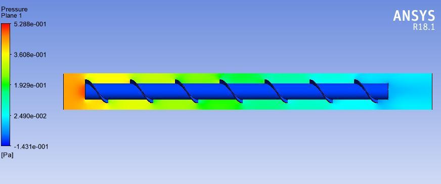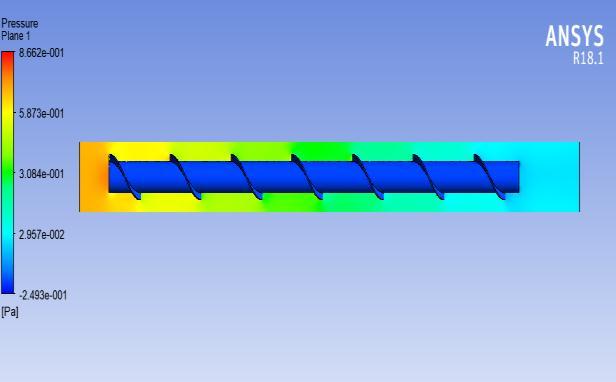 In figure 5.8 above, the pressure plot obtained for CuO/water (2 percent volume fraction) as fluid is Illustrated. As Illustrated by the orange and dark red colors, the plot indicates higher inlet pressure. The pressure near the helical screw tape is high in the magnitude of .86Pa which reduces as the fluid passes through the coil and move towards the exit. The pressure atexitis.24Pa (negative)asshownbythedark bluecolor region.