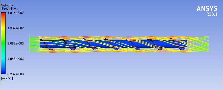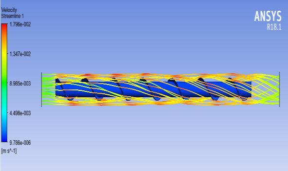 In figure 5.9 upper, the velocity streamline obtained for CuO/water as fluid is Illustrated. The plot indicates a .009m/s fluid inlet velocity at the domain inlet that changes as the fluid passes through the helix region. The streamlined flow of fluid changes to turbulent flow and remains turbulent till the fluid reaches the exit of the domain. The fluid velocity at the helix zone is .018m/s asillustratedin red colored lines while fluid velocity at the outletisthesameasthatoftheinlet.