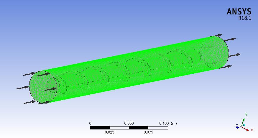 The CAD model of helix geometry is built in Creo modelling software using dimensions from the literature [50]. 'The cylindrical part of the insert has a diameter of 19mm,andthehelicalinsertsweptaroundithasaheight of4mmandawidthof1mm.Theinsertisapproximately 350 mm long and has a rotation ratio of 1.92. It has a 25 mm inlet downwash and ends 50 mm before the outlet'[50]. The CAD model is encased in a cylindrical enclosurethatconformstothedimensionsspecifiedinthe literature[50].