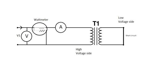 Thistestisconductedonthehigh voltage(HV)sideofthetransformerwhenthelow voltage(LV)side(orthesecondary)is short circuited.Awattmeterisconnectedtotheprimaryside,anammeterisconnectedinserieswiththeprimarywinding. Withthehelpofavariac,theappliedvoltageisslowlyincreaseduntiltheammetergivesareadingequaltotheratedcurrentof theHVside.AfterreachingtheratedcurrentoftheHVside,allthreeinstrumentsreading(Voltmeter,Ammeter,andwattmeter readings)arerecorded.TheammetersreadinggivestheprimaryequivalentoffullloadcurrentIL.Asthevoltageappliedfor fullloadcurrentinshortcircuittestontransformerisquitesmallcomparedtotheratedprimaryvoltageofthetransformer, theironlossesinthetransformercanbetakenasnegligiblehere.