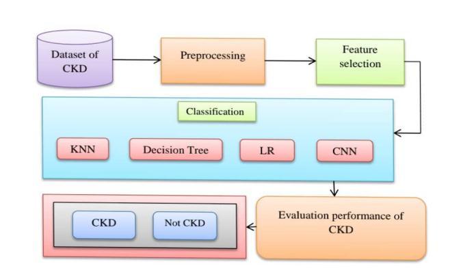 Several prior related studies were used to evaluate the performanceoftheproposedsystems.Theaccuracyranges ofthepreviousresearcharebetween96.8percentand66.3 percent,itshouldbeemphasised,butthesuggestedsystem has achieved accuracy of 100 percent using the Convolutionalneuralnetworkmethod.Whencomparedto current systems, it is seen that the proposed has the best outcomes.Thedatasetisrandomlysplitinto25%fortesting andvalidationand75%fortraining.Tochoosetheirrelevant subset characteristics, the Recursive Feature Elimination approach was presented. Then, classifiers were used to process the chosen features in order to diagnose CKD. It should be highlighted that the suggested system has producedencouragingoutcomes.Inordertoprioritisethe featuresandassigna percentageto eachfeaturebased on thecorrelationwiththetargetfeature,weutilisedtheRFE algorithmtodeterminethebestassociationsbetweeneach featureandthetargetfeatures.