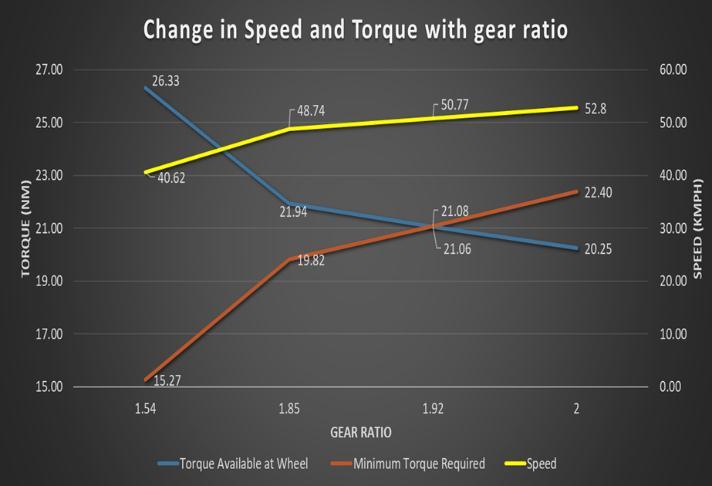 Speedandtorqueareinverselyproportionaltoeachotheri.e.asspeedincreasestorquedecreases.Speedisafunctionofgear ratioandthustoselectthegearratiowhereoptimumtorqueandadequatespeedcanbeobtained,weperformedanalysisof characteristicsofspeedandtorquev/sthegearratio.Asshowninthefigure,thethreelinesrepresentTorqueAvailableat wheel,minimumtorquerequiredandSpeedofthevehicle.Torqueavailableatthewheelistheactualtorquedeliveredbythe transmissiontothewheel whereasminimumtorquerequiredistorquerequiredtoovercomealltheforcesactingonthe vehicle and make it run on plain road. For gear ratio 1.92, the minimum torque required line coincides with the torque availableline implyingthatthegearratiocannotbefurtherincreased.Forgearratio1.54,theTorqueavailableissufficiently largethantheminimumtorquerequiredandspeedatthethatgearratioiscloseto41kmph.Hence,gearratio1.54was selectedforinitialtestingandvalidationofthedesignandbasedonresultsfurtherchangeswillbemadeingearratio.