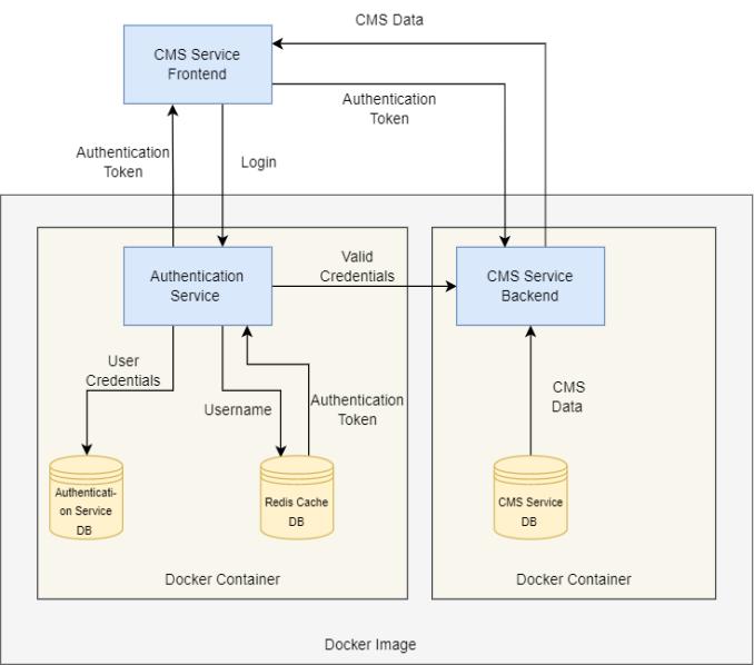 Asseenintheabovefigure,therearetwoservices,the CMSserviceandtheAuthenticationservice.TheCMSservice has a frontend and a backend. Once a user logs into their account,theusercredentialsarestoredintheAuthentication service database and the username is used to generate a uniqueauthenticationtokenfortheuser,whichisstoredin theRediscachedatabase.Thisauthenticationtokenissent back to the CMS frontend and all requests to the CMS backend are authenticated using the token. If the token is valid, data is sent from the CMS service database to the frontend.TheCMSservicebackendandtheauthentication service are dockerized into their respective Docker containers.ADockerimageiscreatedcomprisingofthese twoDockercontainers.Inordertoruntheapplication,only thedockerimageneedstoberun,usingdocker compose.