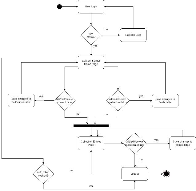 As seen in the above figure, first, the user is prompted to login.Iftheuserhasanaccount,thecredentialsareaccepted otherwisetheuserisdirectedtotheregistrationpagewhere theycreateanewaccountwithwhichtheycanlogintothe CMS service. Once logged in, the user is directed to the Content Builder page where they can add, edit and delete contenttypesandtheirrespectivefields.Anychangesmade are saved to the collection and fields tables of the CMS servicedatabaserespectively.Sinceauniqueauthentication tokenisgeneratedforeachuserwhentheylogin,thereisa continuouschecktoseewhethertheauthenticationtoken hasexpired.Ifthetoken expires,theuserisautomatically logged out of their account and taken to the login page. Otherwise, the user can continue to make changes on the CMSpages.Iftheuserdoesnâtwishtoadd,editordeletethe contenttypeoritâsfields,theycannavigatetotheCollection