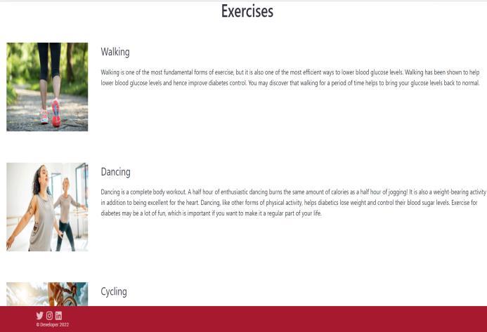 Themodelwouldrunonthebiologicaldetailsprovidedand predictwhethertheindividualisatariskofgettingdiabetes. Incaseanindividualisprone,anewpagewithrecommended dietcharts,exercisesetc.areprovidedinordertopre treatit effectively.ThisisshowninFigures3and4.
